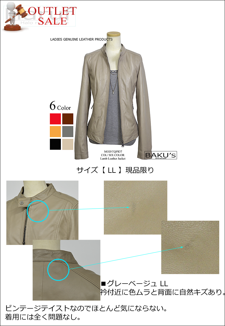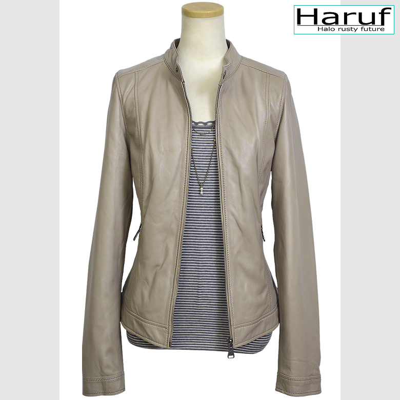 【アウトレットセール】 レディース レザージャケット 本革 ラムレザー グレーベージュ LLサイズ NO1994