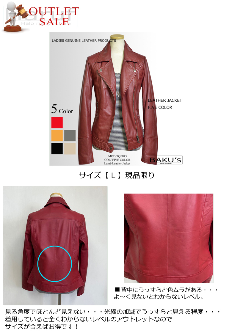 【アウトレットセール】 レディース レザージャケット 本革 ラムレザー レッド Lサイズ NO2019