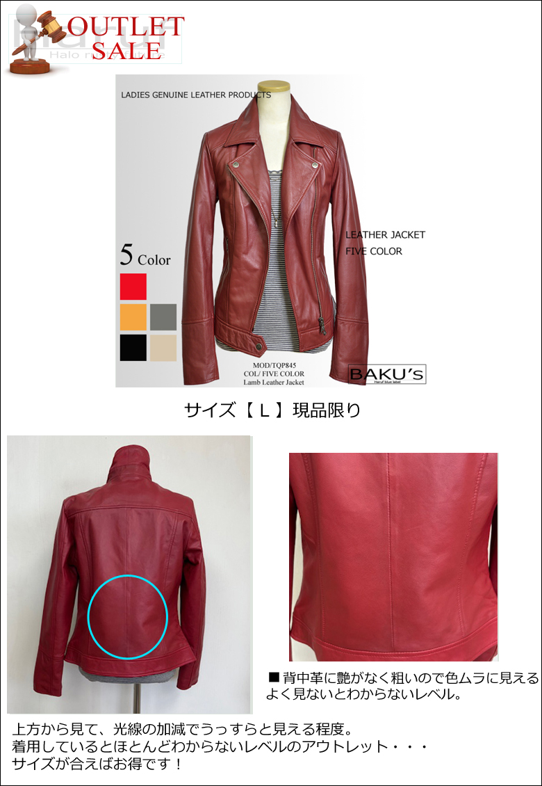 【アウトレットセール】 レディース レザージャケット 本革 ラムレザー レッド Lサイズ NO2020