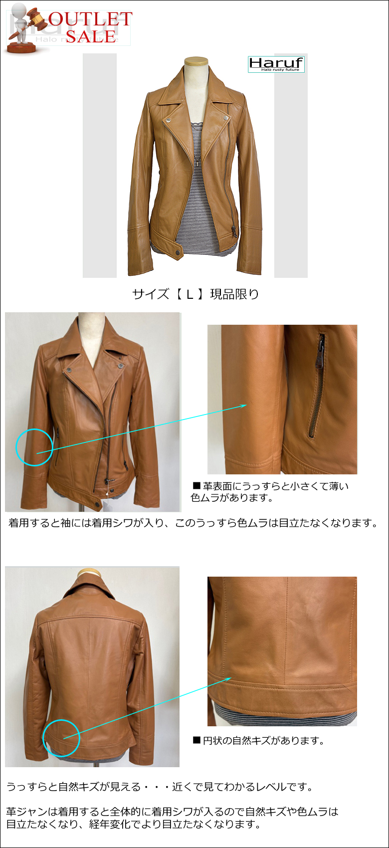 【アウトレットセール】 レディース レザージャケット 本革 ラムレザー キャメル Lサイズ NO2031